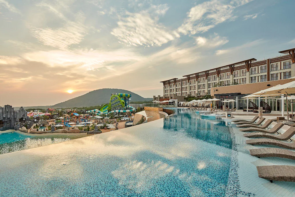 The complex includes a theme park, water park, shopping areas, and multiple dining options, making it especially popular with families and groups. Rooms are modern and spacious, and the variety of activities means you can easily spend several days without leaving the resort.