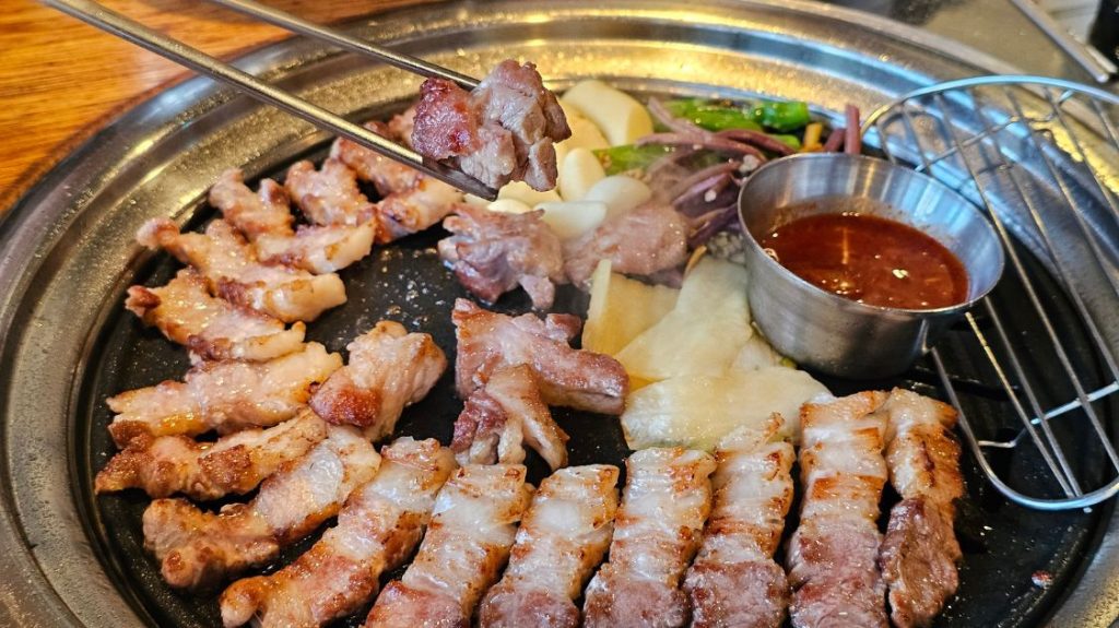 9. Samgyeopsal (Grilled Pork Belly): Thick pork belly slices grilled at your table, wrapped in lettuce with garlic and ssamjang. Korea’s most popular social dining experience, best with soju and friends. Every Seoul neighborhood has multiple samgyeopsal spots. Difficulty: Easy.