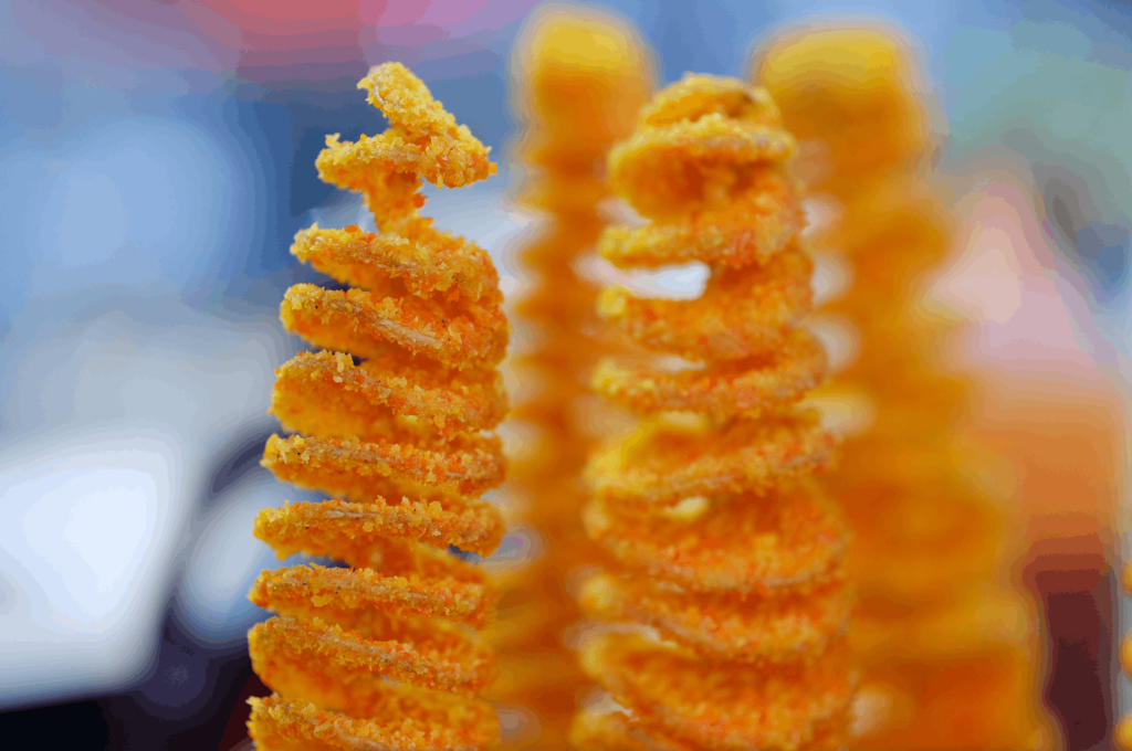 - Tornado potato (hoeori gamja): A spiral-cut potato on a stick, fried and seasoned (cheese or honey butter are popular). Around 4,000–5,000 KRW ($2.75 to $3.50 USD).